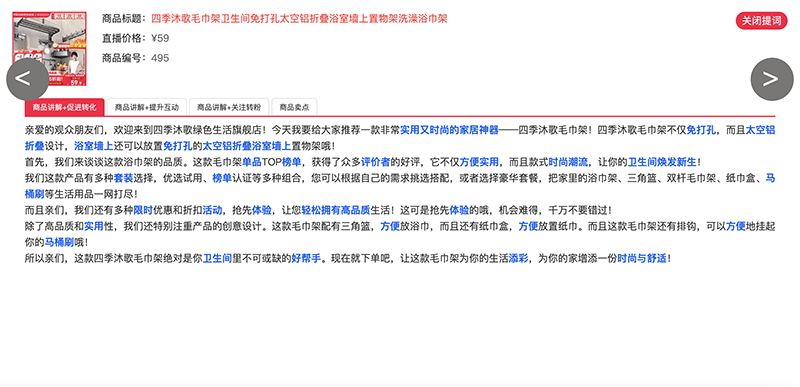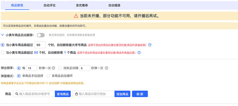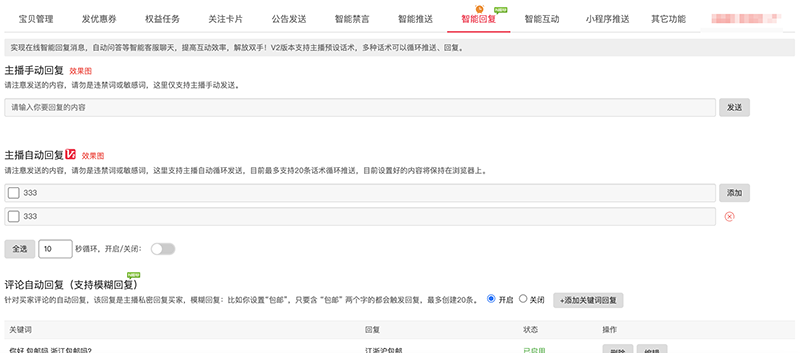 帮助主播一站式解决直播问题,具体功能包括自动讲解、弹宝贝、发优惠券、弹直播间权益任务、关注卡片,批量弹公告,智能提词、智能推送、智能禁言、智能回复,自动发评论、智能互动、无人直播等。