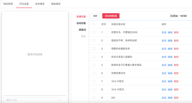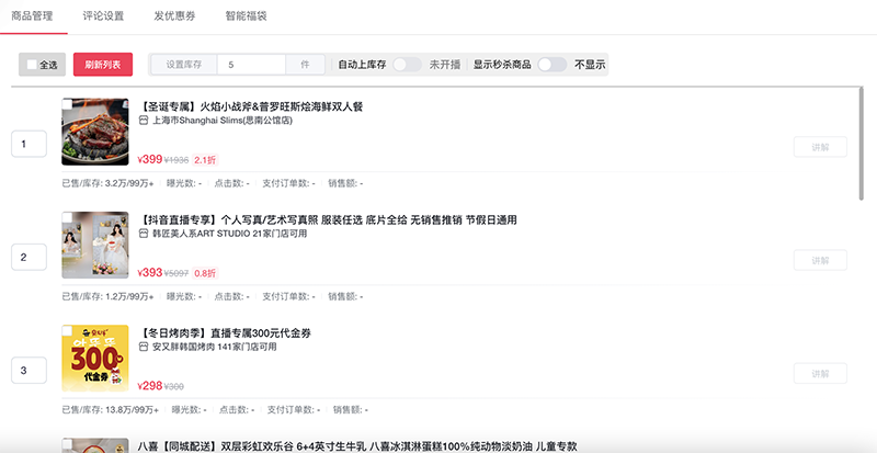 为本地团购直播达人提供直播方案:具体包括批量商品管理、讲解、弹品,自动秒杀补库存、小风车,自动回复、评论,自动发优惠券、福袋等。